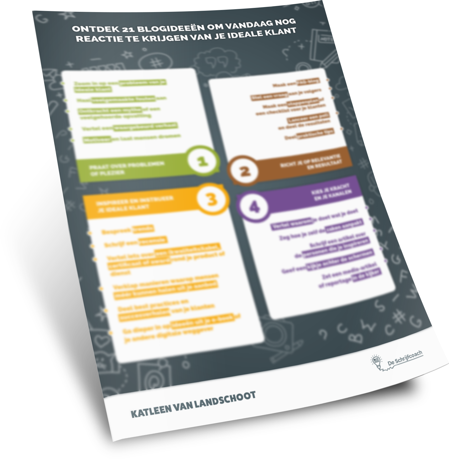 Deze vierdelige structuur helpt je om onderwerpen te kiezen die je ideale klant herkent, relevant vindt én graag leest. Samen met 21 concrete invalshoeken weet je altijd wat je kunt delen.